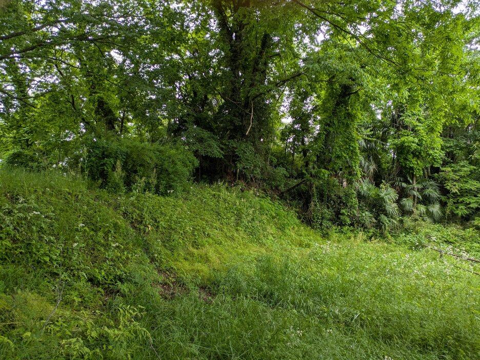 梁川城遺構・復元物 土橋、堀、土塁跡