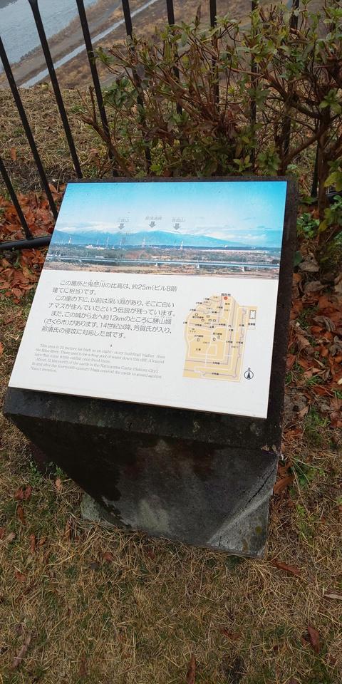 飛山城碑・説明板 鬼怒川に面した北崖