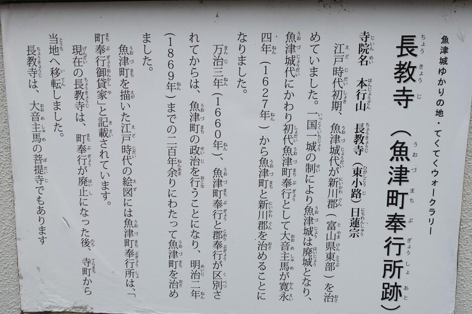 魚津城に投稿された周辺スポット(カテゴリー:碑・説明板)、「長教寺(魚津町奉行所跡)」の情報がご覧頂けます。
