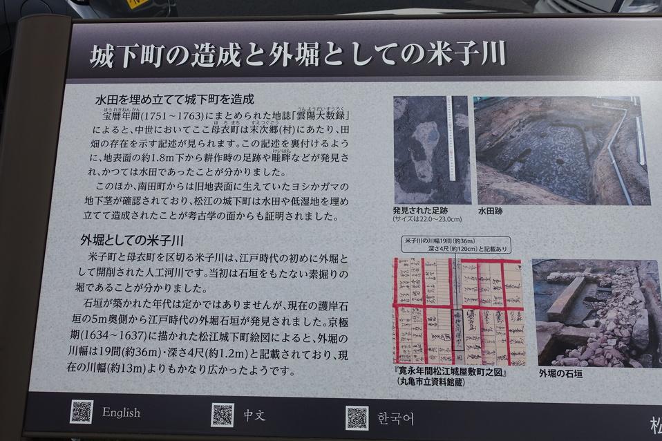 松江城碑・説明板 城下町の造成と外堀としての米子川