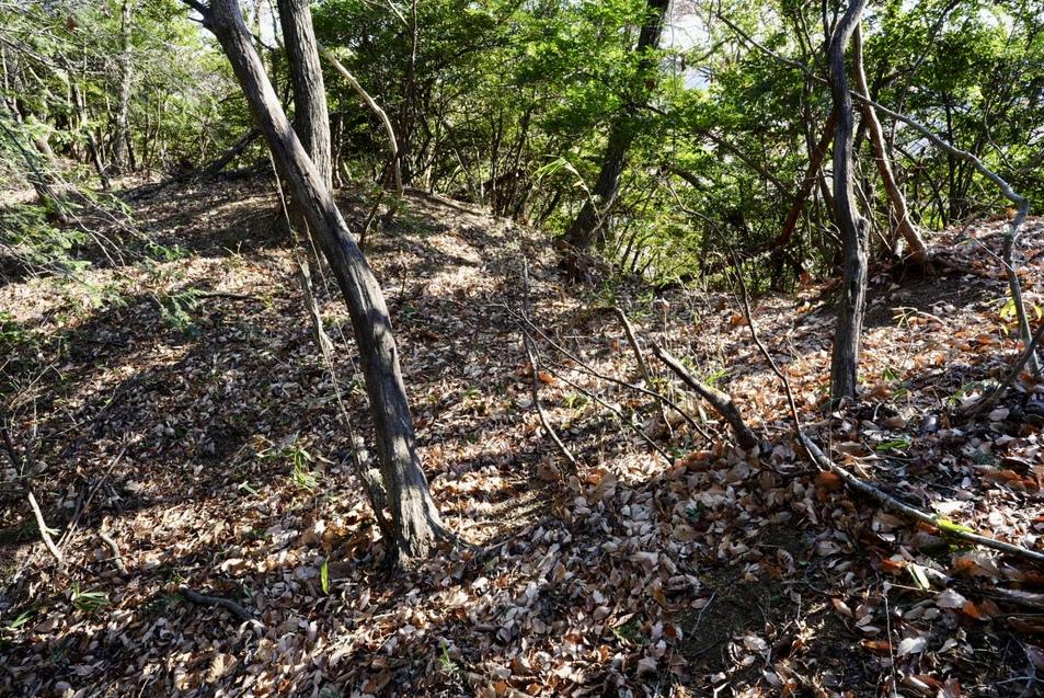 東端部は愛宕神社が建つ郭(写真1枚目)、その先には凱旋記念碑のある小さな郭があります(写真2枚目)。神社から西側に延びる尾根の急坂を登ると石の祠がある細長い郭があります(写真3枚目)。その先には堀切(写真4枚目)で仕切られた主郭とされるやや広い郭があり、西側に3段の腰郭が確認できます(写真5枚目)。主郭の先端には虎口が設けられ(写真6枚目)、1段下に2段の郭があります(写真7枚目)。
