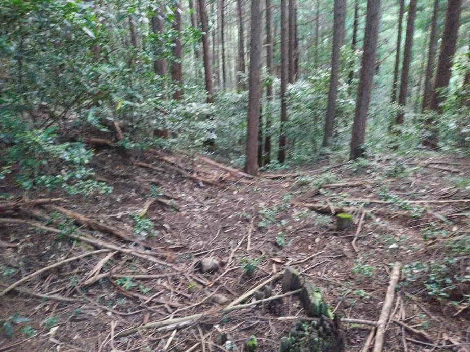 お城には先人様の登城口が見つからず、工場向かいのゴミ回収ボックスと地蔵が並ぶ場所から入りました。細い道を入り、30m程にある墓地脇を城に向かって進むとピンクリボンの巻いた木のある分岐があり、右側に進むとすぐに堀切に当たります。目の前は主郭の切岸ですが、武者走り風の滑りやすく歩行注意の道がついており、登ると主郭東側の郭の堀切の脇に出られます。4つの郭で構成されており、それぞれの郭を堀切で分断、主郭と西の郭の各西側には土塁、西側の郭の尾根道の先にも堀切が見られます。