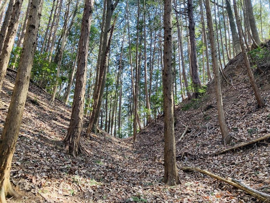 ①山麓から山上へ向かう途中の堀切と土橋。