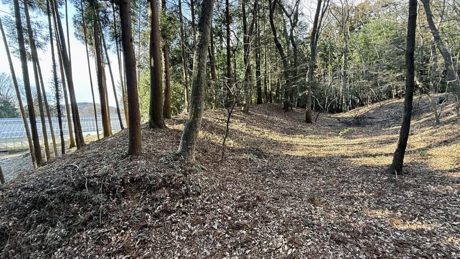 城址標柱(写真6枚目)の前に車を停め、溜池の他を少し過ぎた薮の切れ目から取り付きました。お城は独立した台地を活用したほぼ単郭のもので、本丸の周りをやや甘めの空堀が囲んでいます(写真3,4枚目)。私が登り始めた西側の地点が、空堀が食い違った場所で、南側から緩やかに下っている空堀と、やや上段を北側から廻ってくる空堀を竪堀で繋いでいます(写真7枚目)。