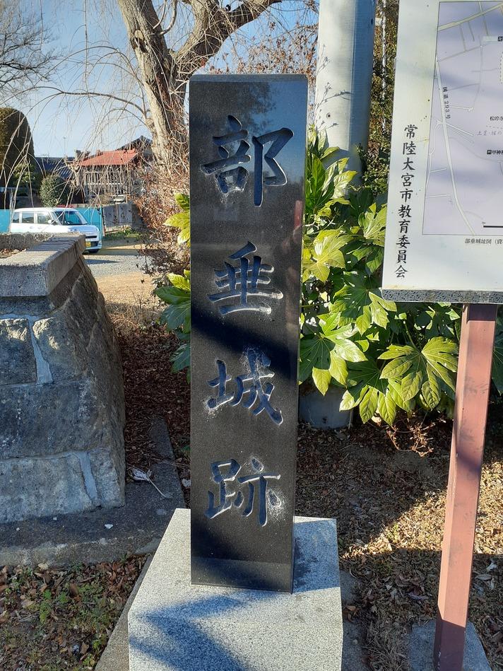 常陸大宮小学校正門すぐ横に部垂城石碑と案内看板。駐車場あり。2026/01/21 15:00くらいにきた時には駐車場ガラガラだったので車を止めさせて頂きました。