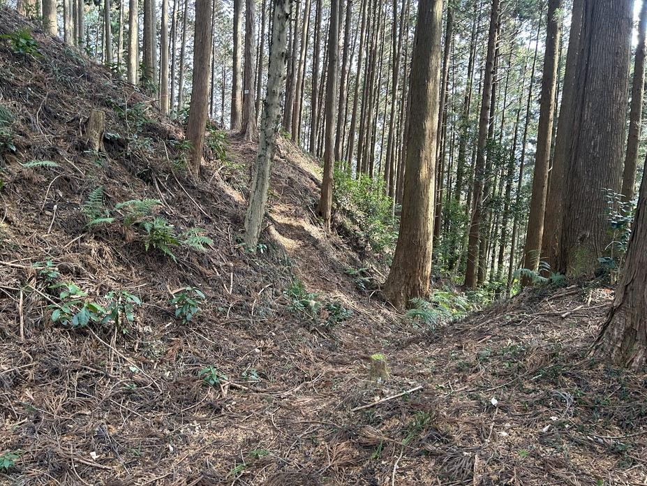 北東背後は堀切を挟んで郭があり、その先は更に堀切で遮断。堀切の規模は深さ5m、幅6mほどあり、まずまずの大きさです。