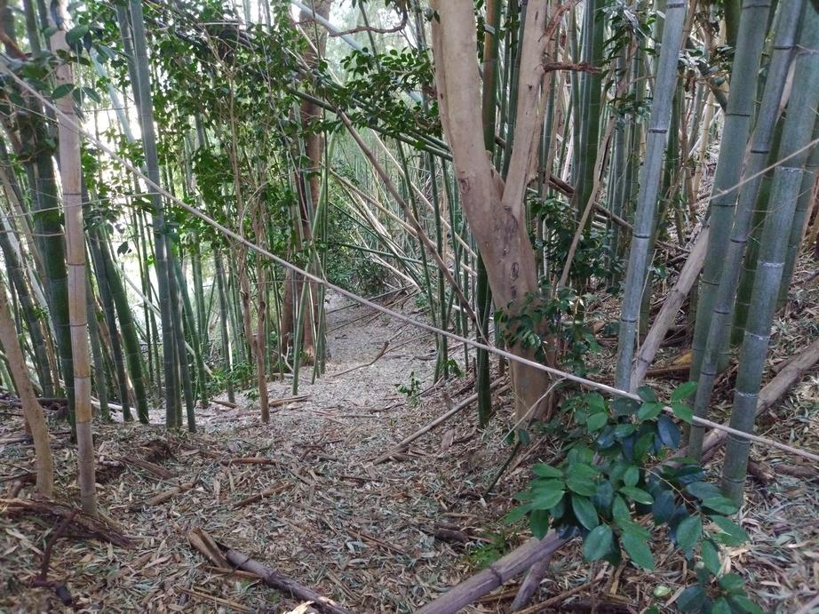 お城の中央部分は高速道路となっています(写真3枚目)。高速道路北側の台地は薮と畑になっていて、遺構らしきは見当たらず(写真1,2枚目)、高速南側に橋を渡ると西側に古墳が見られます(写真4枚目)。側道を東に進むと鉄塔が立っており、台地の先端となっています(写真5枚目)。遺構は見られませんが、南側には古くからありそうな道が付いています(写真6,7枚目)。古墳と鉄塔の間には、僅かに土塁が残るようですが、薮のため確認できませんでした。吉井郷土資料館では、発掘調査を元にした復元図を見ることができます。
