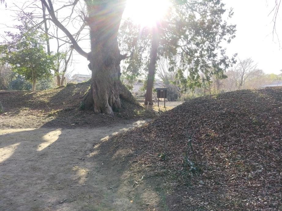 お城は鏑川の20mの断崖を背後に、南側には比高差15mの沢が流れる要害の地で、規模は東西80m、南北140m程となります。赤城神社が鎮座する約40m四方の本丸には川と面した東側を除き三方に土塁が残ります(写真1~4枚目)。本丸を囲む二の丸は、近年まで南と西に堀が残っていたようですが、埋められてしまったようです。北側の堀は、建設会社の駐車場になんとなくそれらしい痕跡が見られました(写真5枚目)。
