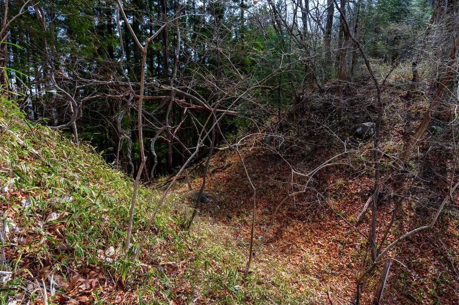 源頼朝が建久4年(1193)に築き、飽馬氏を封じたとの伝承がありますが、城は戦国時代のものとみられます。詳細は不明で、付近を通る間道を押さえるための城と考えられます。ささやかな規模の城ですが、枡形風の虎口があり、横矢の工夫が随所に見られるなどしっかり作り込まれているので、上州に進出していた甲斐武田氏が関わっていたのかもしれません。