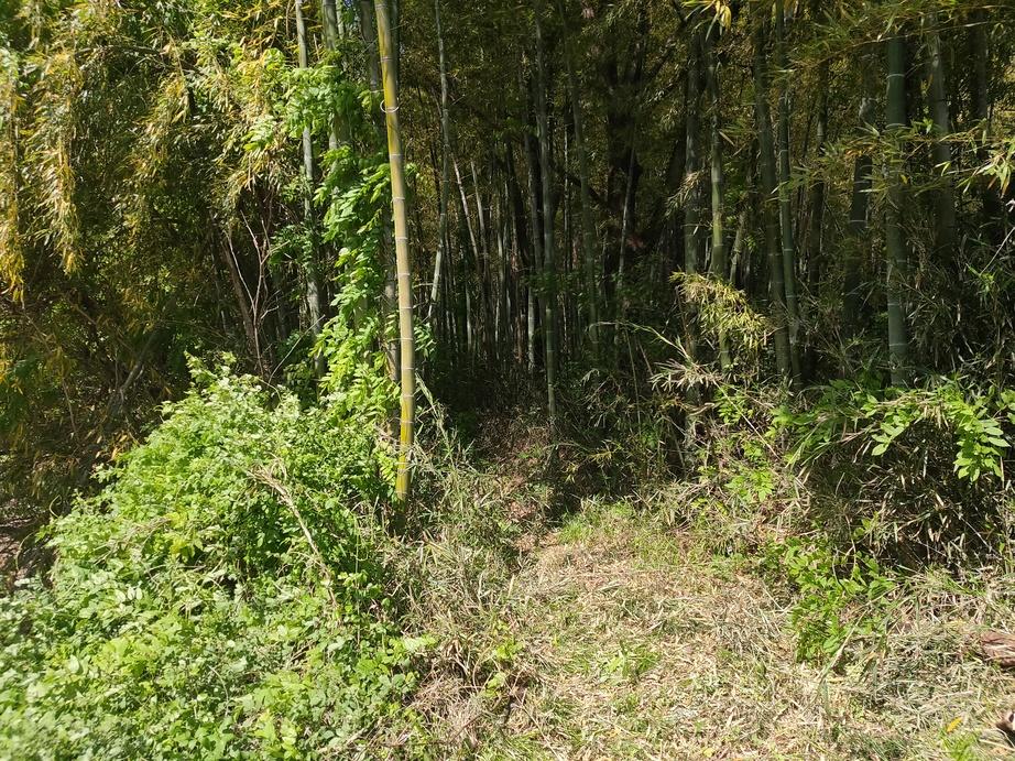 お城には、低山ということもあり、西側の貯水池と思われる上沼(写真4枚目)の脇(写真1枚目)から直登しました。山はかなりの藪になっていますが、なだらかで、三段になっており、上段の主郭は広さがあり、削平もされていますが(写真3枚目)、段差は1mあるかないかで(写真2,5枚目)、城郭的な雰囲気は感じられませんでした。藪がひどく西側のみの探索でしたが、山腹には原付バイク(パッソル・昭和の遺物です)や住宅の解体した残骸などが投棄されており、昭和の頃には植林の道が山頂付近まできていたように思われ、地形も若干改変されている可能性を感じました。