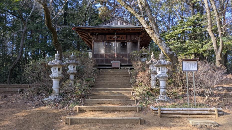 S54に中田正光氏に確認された城址で、北条氏照の時代に設営と推定されている。現在は北郷神社になっていて、社のある本丸には土塁が認められ、虎口もしっかりしている。本丸の先に一段下がった平地があり、二の丸?とも考えられる。駐車は参道手前の伊奈配水所前なら若干の駐車は可能と地元女性より教わりました