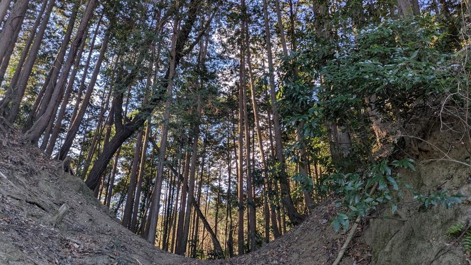 石灰採掘で城の北側は失われたものの、立派な堀切や郭が残っています。多少なりとも“お城学”をかじった私達は「お城じゃん」と思うのかも知れませんが、地権者はどうなのでしょうね。間伐をされていて出入りはあったと思うんですが全く気づかなかったのか、それとも隠していたのか。令和の世になってもあるところにはあるものですね。