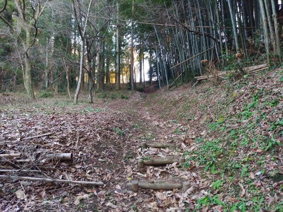 成毛市民の森の最上部が城址となります。駐車場に車を停め、遊歩道を登ったところにお城があるはずでしたが、たどり着いてみると、急傾斜地崩壊対策の工事中で、遺構は破壊されたところで残っていませんでした。2025年のGoogleマップの衛星写真は工事前ですので、ギリギリアウトと思われます(12月23日訪問)。人の命に関わる工事なので致し方ないことですが、タイミングを逃してしまいました。規模はないものの、枡形虎口や土塁、堀切が残っていたようですので残念です。