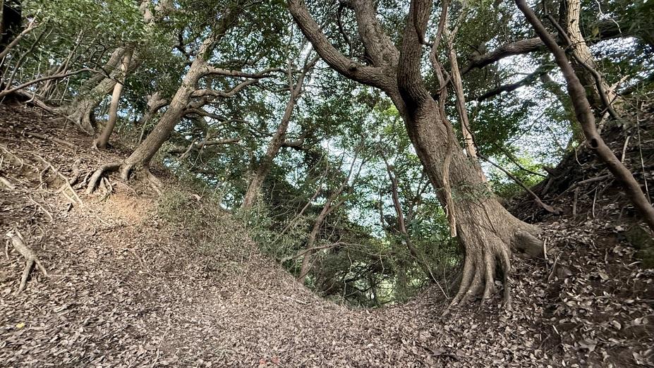 ②登城路に現れる切岸。上は三郭。