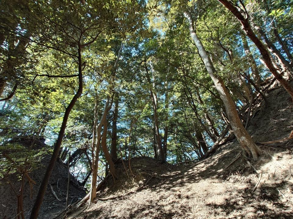 主郭南東側の虎口から降り、主郭の切岸に沿って北西に移動。