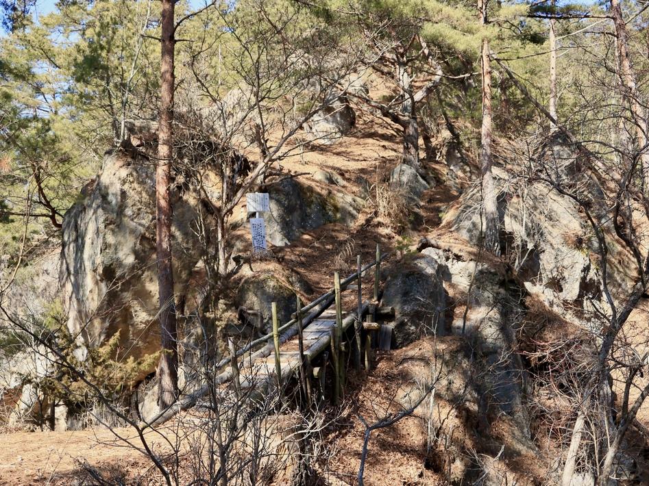 堀切跡とも見て取れる窪地形に架かる木橋を渡り、痺れるような細土橋様地形を進んで城地を目指す。何処から城域が始まるのかは判断に迷うところだが、個人的には前述した窪地形の背後、痩せ尾根から急に斜面が立ち上がる部分がそうだと考える。