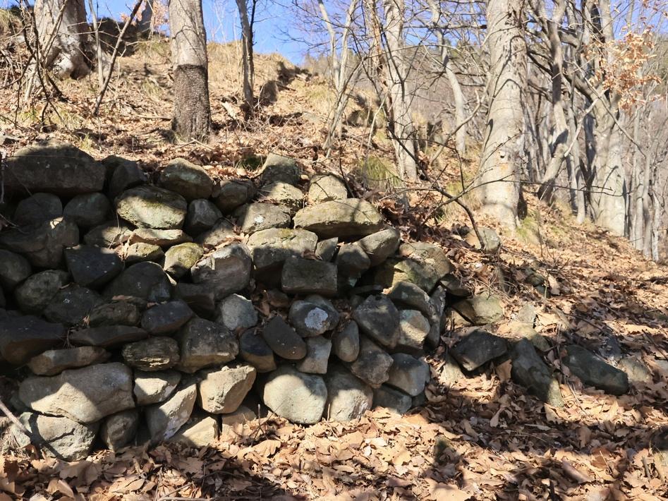 浦野城の主郭の西方約0.2kmの位置には、別城一郭とも言える、同じ岡城のリア攻めマップにある物見松砦が立地している。その名称のとおり、物見の役目を果たし、浦野城への障りとなる上段山尾根への東麓からの侵入を防ぐものであるんだけど、小さな二段の砦であるにも拘らず、主郭西側山側背後を断ち切るのはしっかりとした四連続堀切ていうぱ〜ぷりんな普請…腹ぺこだったんで今回は訪ねなかったんだけど、下山したら無性にもう一度阿保っぷりを見たくなってしまった。今度近くに来た時にでも再訪しよう。