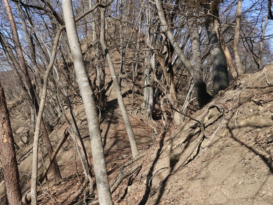 ※訪ねてみれば理解出来るけど、結構、凄い場所だ。崩落等によって形成された、痩せ尾根、急崖、絶壁等が凄まじく、砦も部分で崩落しているんだそう。ちなみに冬場のこの辺りのお山は生命感が全く欠けている。