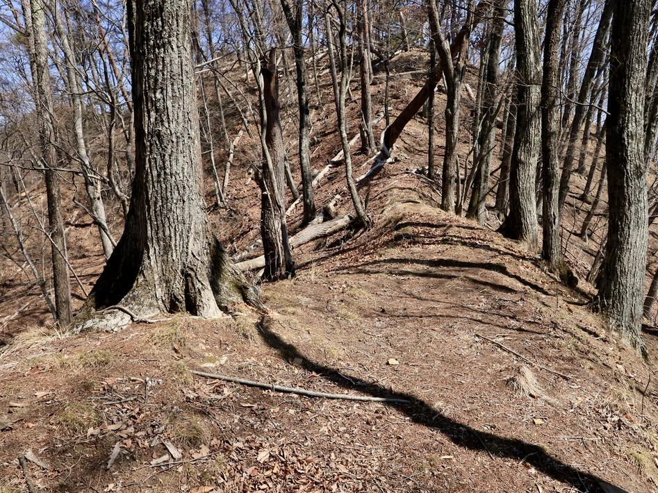 佐々野城からは凄まじい地すべり地形を経た後に一騎駆けの長大な細土橋様地形を進んで城域に入る。信濃のお城の神は渡り切った所にある小ピークを南堡塁として縄張に含んでいるが特に何かがある訳ではない。眼前には主郭も見えているが此処からの登頂は困難なので主郭からの北東尾根を巻いてから登るのがよい。