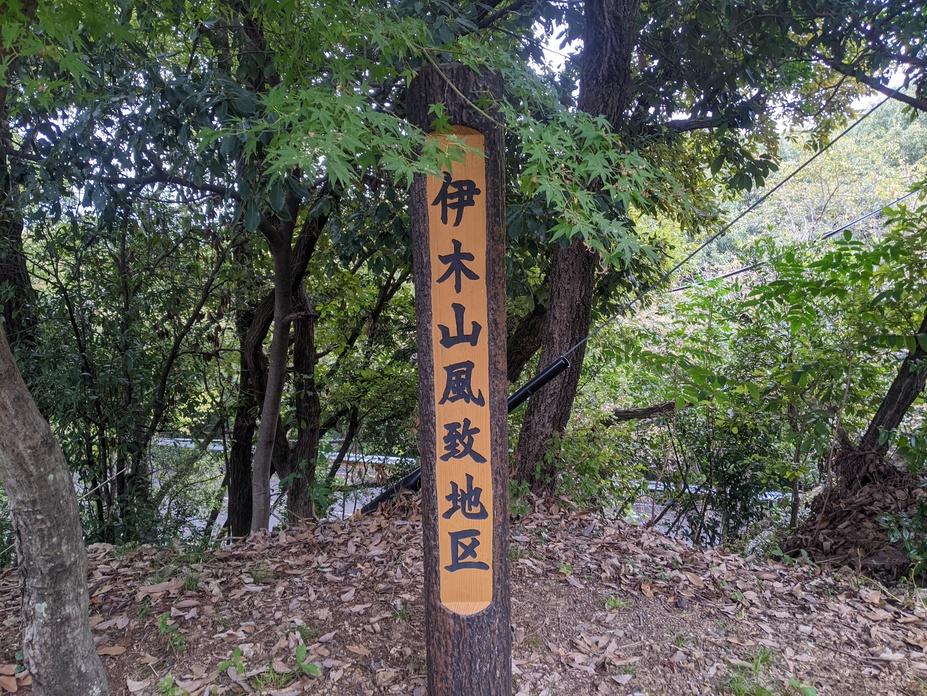 案内看板の横にある標柱、「伊木山風致地区」が一瞬「伊木山屋敷地区」に見えてしまった…。