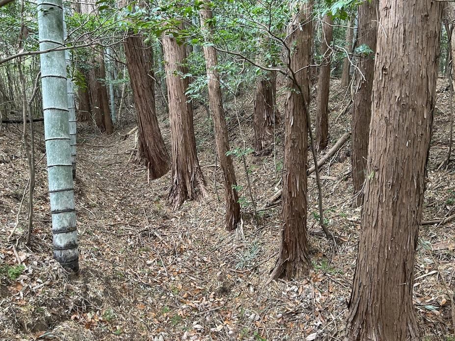 主郭南側に虎口が開口し、南西に空堀を設けて二郭、更に空堀を隔てて三郭と続いていましたが、三郭は県道により削られています。