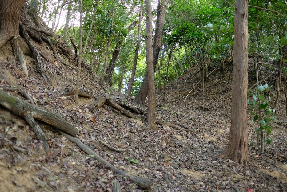 阿坂城の二つの出城のうちの一つ。県道58号からJA松阪阿坂の方へ曲がり、高速道路の方に向かって進みます。高速の下をくぐった辺りから案内板が出てくるので、これに従って山の中に入ります。が、この案内板はあくまでも歩行者に向けて書かれた物です。私は車で行けると思って突入してしまい、車を傷付けた上に方向転換も出来ず、来た道を延々バックで戻る羽目になりました。軽トラでもない限り歩いた方がいいでしょう。高速をくぐってすぐの辺りに路駐し、城跡まで徒歩15~20分ほどでした。