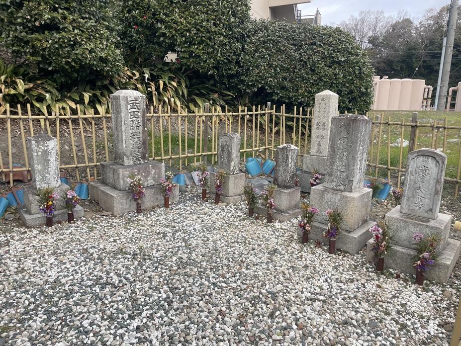 お墓の北側の猪名川公園からアプローチして、新南園橋を園田方面に下った利倉西町交差点🚥からお墓方面を眺めてみました(写真②)写真②で見えている鉄塔の左(東)側のドラッグストアの隣の建物の角を南に曲がった所に墓地(写真③の塀の内側※鉄塔との位置関係が分かればと鉄塔も映るように撮ってみました)はありました。扉を開けて墓地に入り説明板(写真④)や墓地全体(写真⑤)を見学。花が生けているのが印象的で🪻今も地元の方々に大切にされている様子が伝わってきました🪷勝親公のお墓(写真⑥)をお参りすると、お墓の後方に武田菱の瓦があったのでもしかしたらかつてはお堂が建っていたのかもしれません🤔勝親公のお墓の側面に勝親公の生涯について刻まれたと思われる墓碑がありました。※断片的には読める漢字はあったものの全体的な意味は不勉強で分かりませんでした😢以前、『尼崎百物語』という本を購入していたことを思い出し📕めくってみるとこのお墓のことが取り上げられ、墓碑の解説があったので下記に紹介。「・・・武田勝親は甲斐の後主(勝頼)の季子なり。状を按ずるに、天目敗績の日、公生まれて三歳なり。其の臣栗原左衛門某といふもの、公を負ひて城州(山城国)に奔り、これを醍醐の密教院に託す。院主は後主の姻なり。既にして梢々長ず。たまたま斎藤氏嗣無し。公に請ひて嗣と為し、姓斎藤を冒す。戸田侯に尼崎城に仕ふ。遂に之二臣たるを恥じ、乃ち致仕し、摂州椋橋荘富田村に入り、以て浮屠(僧侶)に隠し、名を変じて善悦と曰ふ。状の戴する所、是れに止まる。天和壬戌六月十九日、廃して富田に死す。年百三なり。宅の北に葬る。」天和壬戌を確認してみると天和2年/1682の徳川綱吉公の治世でした。天目山の戦いの年が天正10年/1582なので3歳の時に逃れてきた後100年もの長寿を全うされた人物であることが分かりました。尼崎市内で武田氏関連の史跡に出会うのも驚きで、戦国騒乱期から江戸時代五代将軍徳川綱吉公の時代までの生涯を送られた方がいらっしゃったのも驚きでした‼️