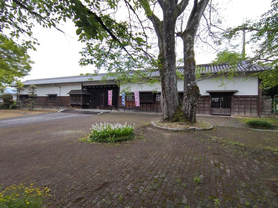 裁判所東隣の史跡公園には再建後の長屋門(正門)が現存し、内部は民俗資料館として整備されています。史跡公園と裁判所の南辺には石垣が築かれ、裁判所の南辺には長屋門から続く土塀も見られます。裁判所南西部には裏門も見えていますが、時季的に草が生い茂っていて遠くから眺めるだけにしました。