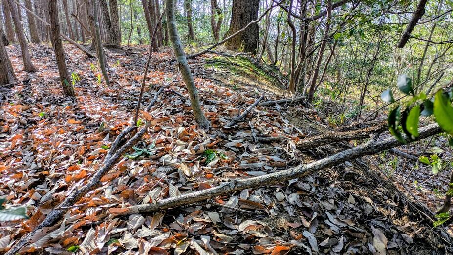 麓を走る県道からの道は大変狭く、離合可能な場所も限られているので小型車がおススメです。約1.3キロ先の分岐で未舗装道に入ってすぐの所に2~3台分の駐車スペースはあります。そこから笹道をしばらく進むとY字路が出てきますが右へ。その先山道は急に細くなりますが、土橋のような道を進むと主郭下の切岸に到着します。R8.1.18訪問