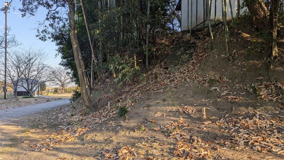 早島小学校の背後にある丘陵に築かれています。現在は早島公園として整備され、公園化により遺構は消失。
