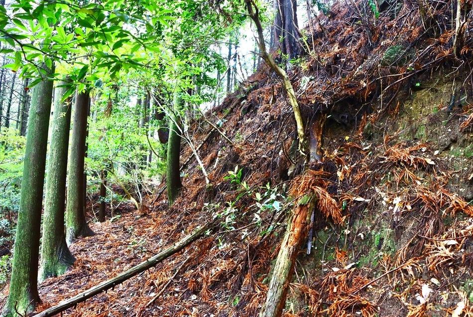 墓地を登って奥へと進めばⅣ郭に登れるので、そのまま尾根に沿ってⅢ郭を見てください。どちらも削平地から少し下ったところに膨大な畝状竪堀群があります。