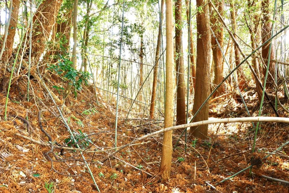綾城からは、南側の谷を挟んだ舌状台地(錦原台地)の南縁部に築かれています。内屋敷には土塁、空堀を廻らし、台地特有の広大な屋敷を構えて、綾氏一族の居館としています。台地下の北側には綾北川、南側は本庄川が流れ、この両河川を天然の濠とします。西は台地上の為、平原に接しています。